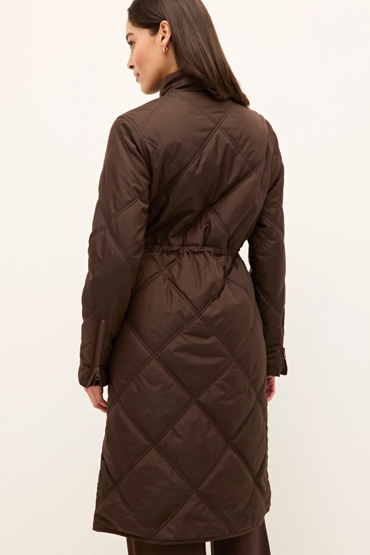 Calling all you Anglophiles. Marie Oliverβs Aiden coat in warm Walnut is a fashion-take on a classic knee-length quilted jacket. English countryside chic, it falls just below the knee for a cozier fit and features a two-way zipper and adjustable waist.