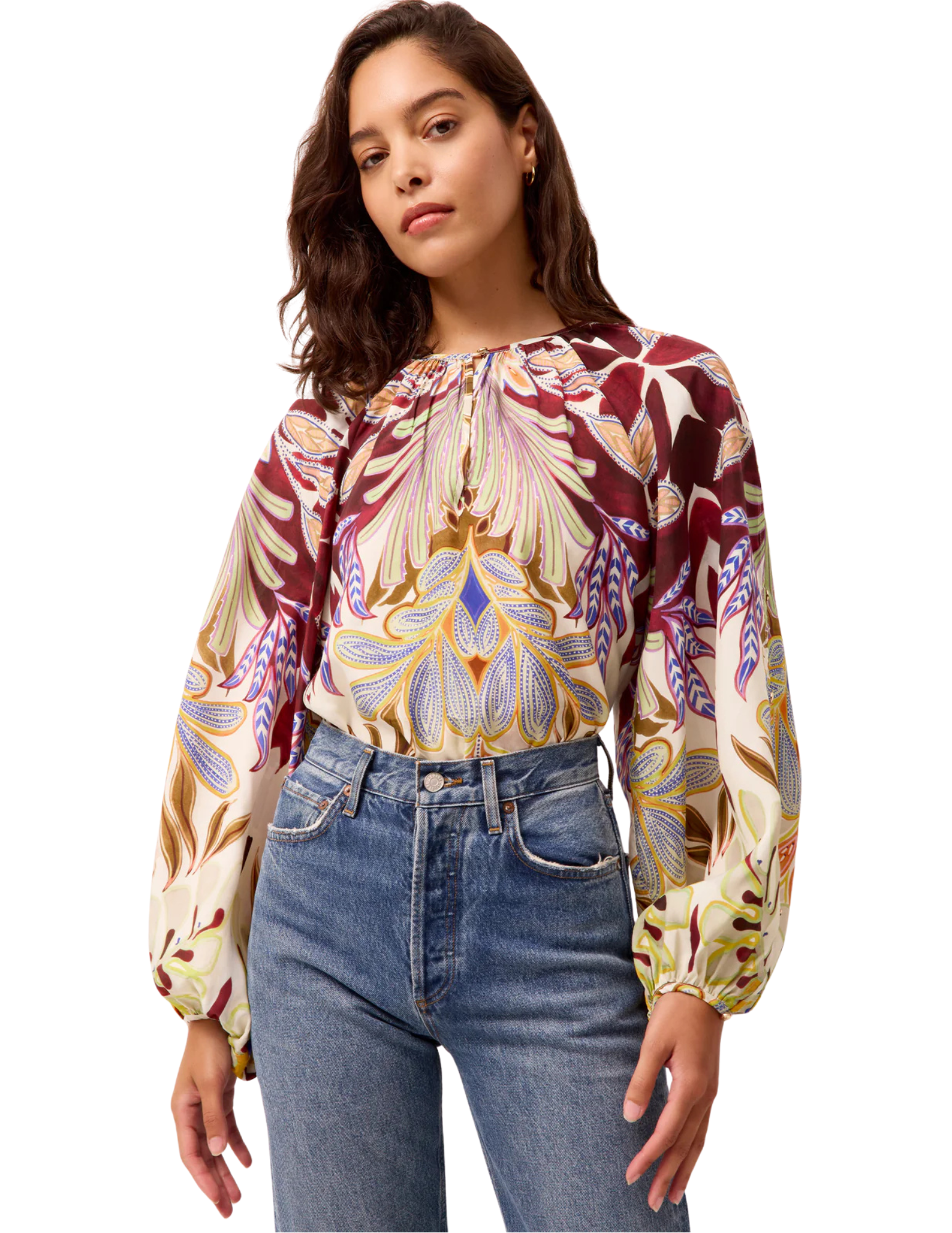 Elevate your favorite denim with this colorful, long-sleeve top. The elegant slip-on silhouette’s simple lines are the perfect canvas for Marie Oliver’s dramatic Tranquility placement print.