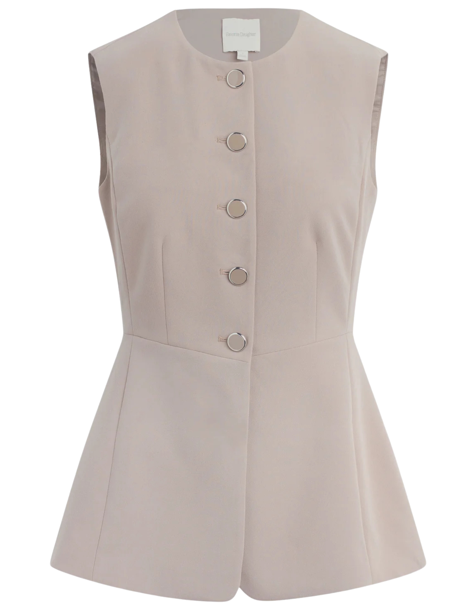 The Clocking In Top is a long-line vest with a crew neckline, exposed buttons, and a fitted waist that flares ever so slightly. it’s cut from a structured suiting blend and looks especially chic when paired with The Favorite Mini Short.