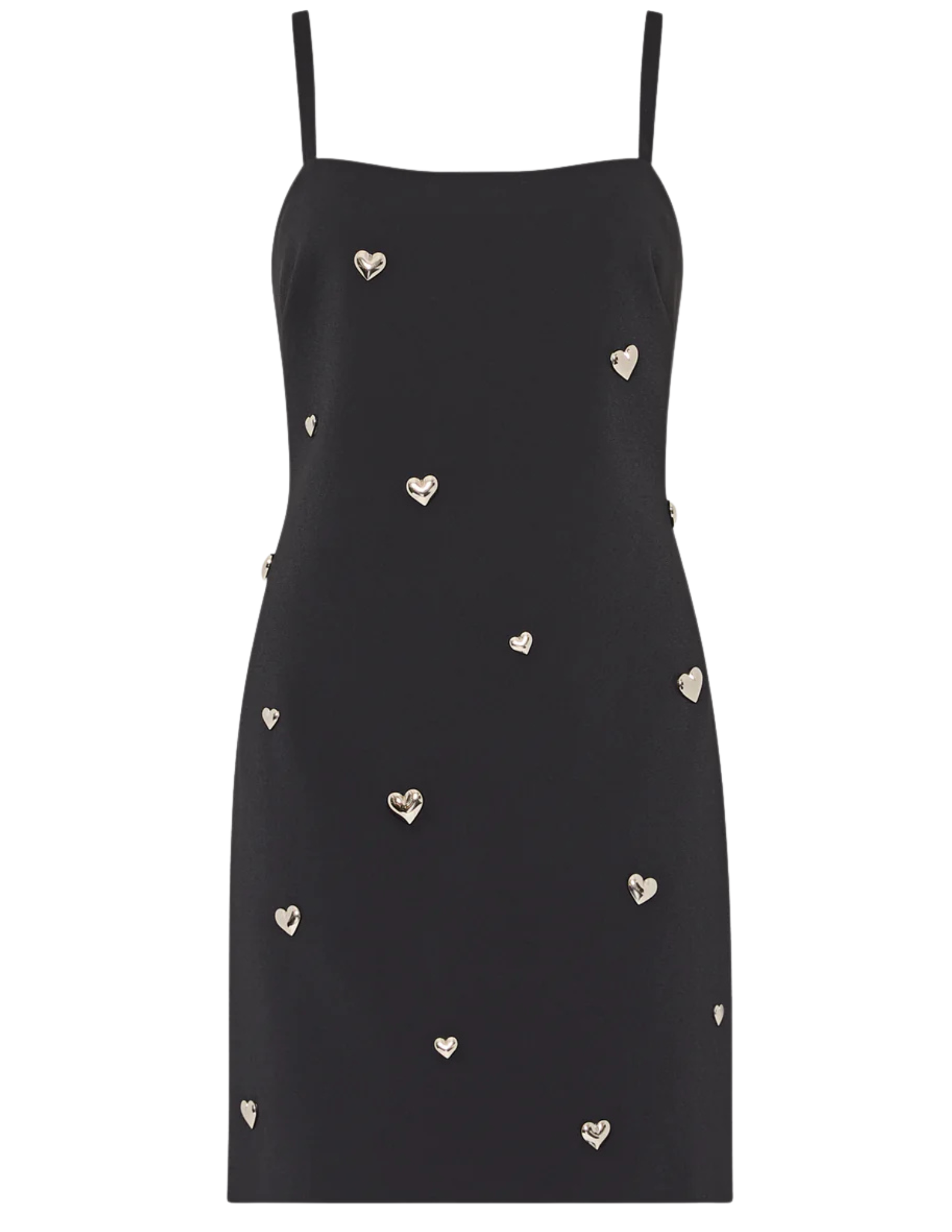 Just in time for the holiday season, the Colette dress is a mini version of a ‘90s slip style spaghetti strap dress. It’s offered in a black fabric with a hint of stretch and heart appliqué throughout.