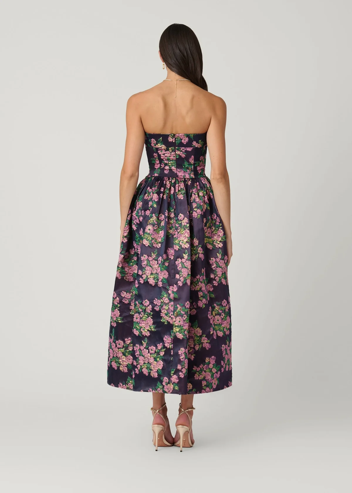 Beautiful strapless dress in metallic floral jacquard. The bodice is lined with an inside bustier for extra support. Skirt hits at ankle length, and is fully lined with side seam pockets. Center back invisible zip closure.
