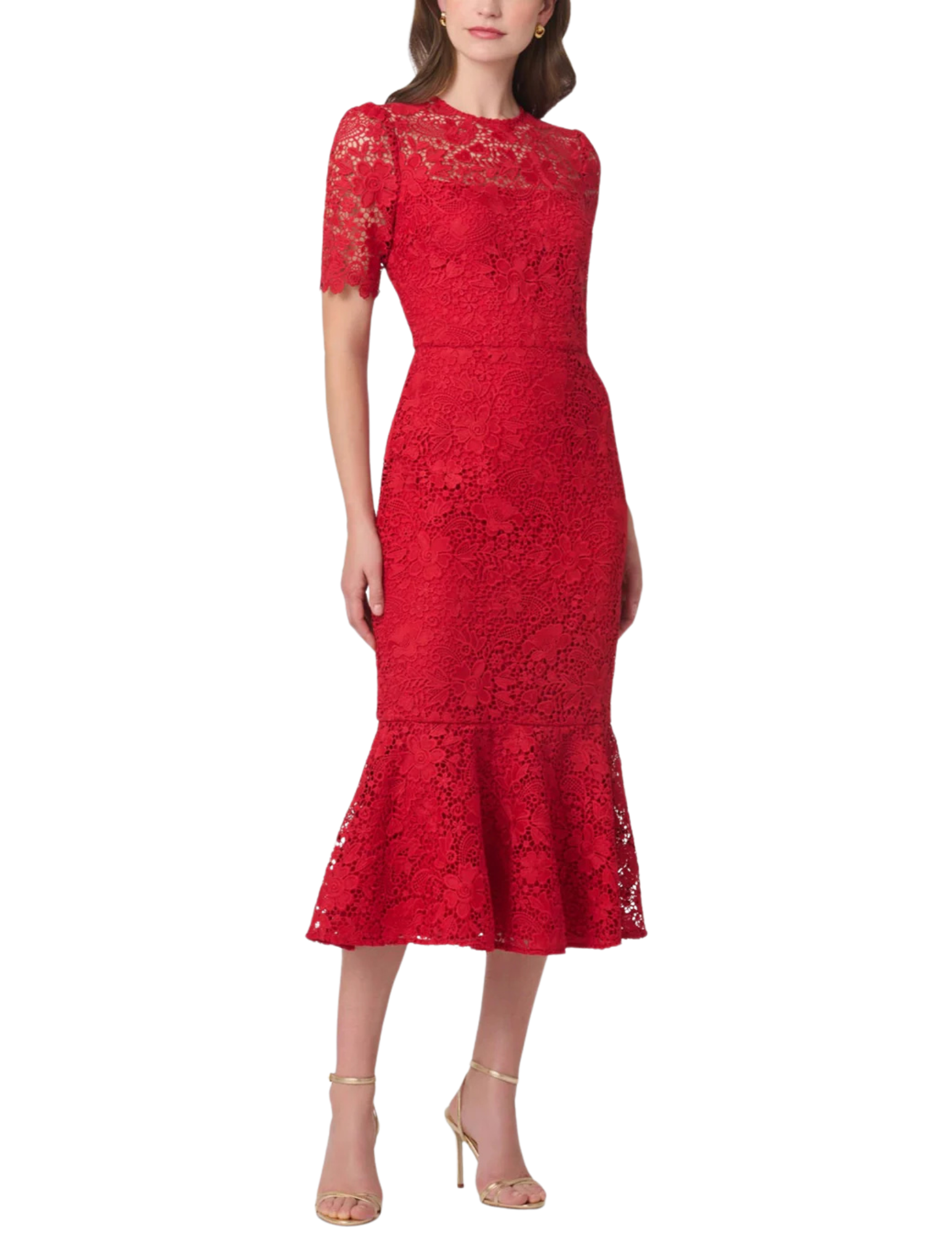 Elegant midi dress in luxurious lace fabric. This style has a crew neckline, short sleeves, and a fitted skirt that flares out around the knee area. The scallop detail accentuates the edges of the sleeves. The sleeves and bodice yoke are unlined for an illusion effect. The rest of the bodice and the skirt are lined. Center back invisible zip closure.