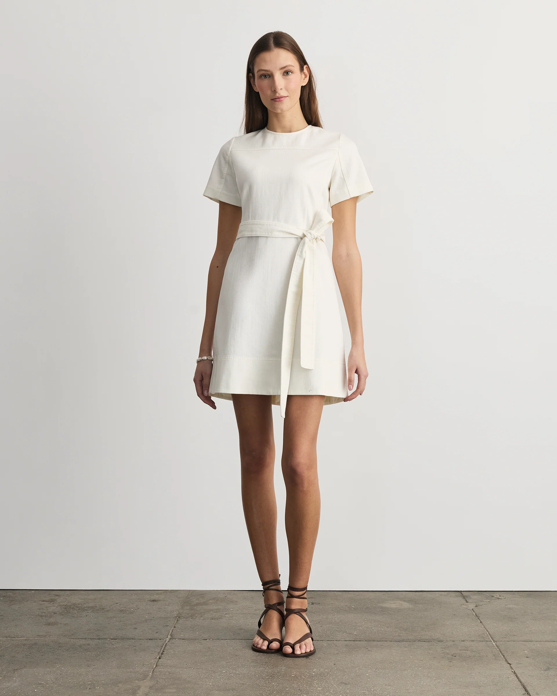 Featuring a figure-grazing fit with short sleeves, a self-tie belt, and a flared skirt, Ella’s silhouette is approachable with a modern twist.