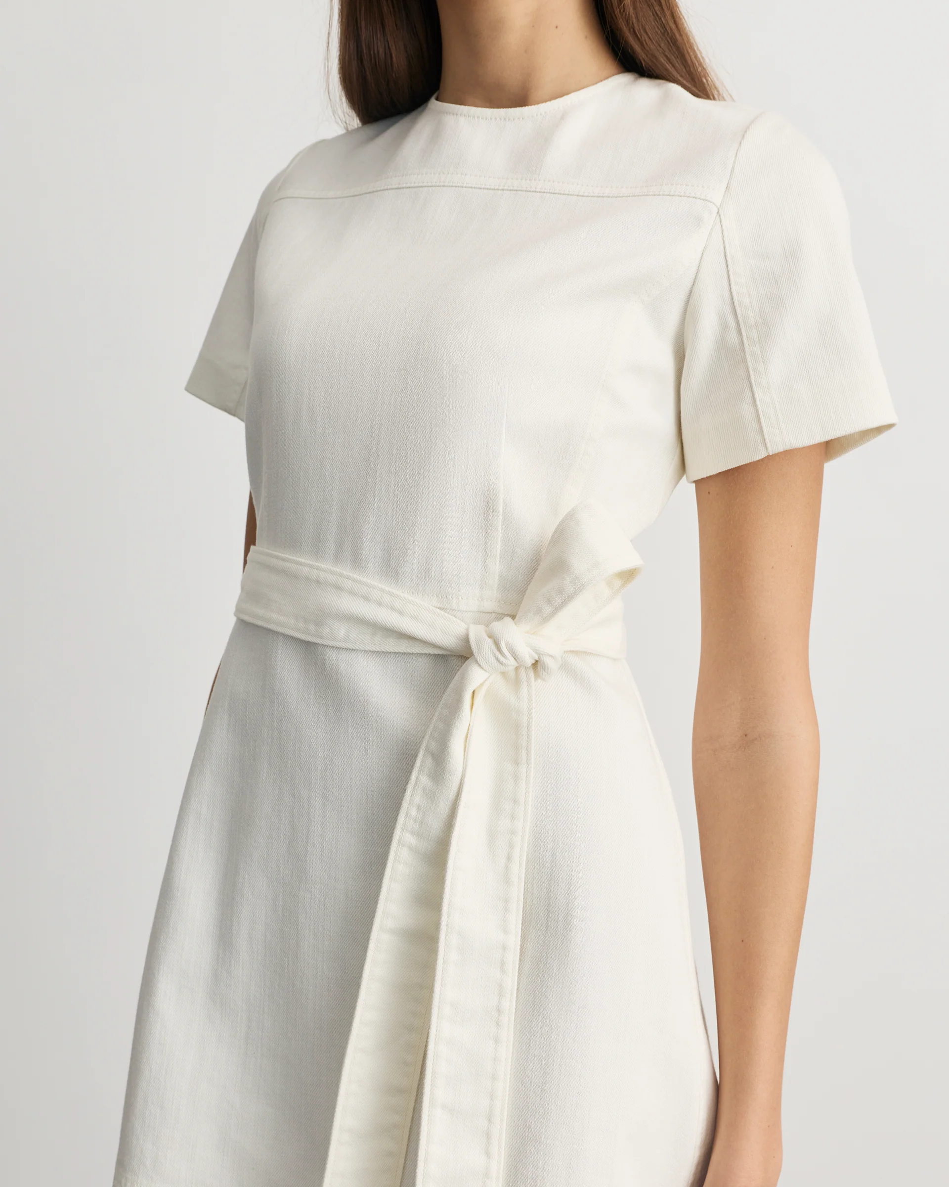 A signature silhouette and best-seller, the Ella Dress returns this season in a soft chalk denim as a versatile mini.