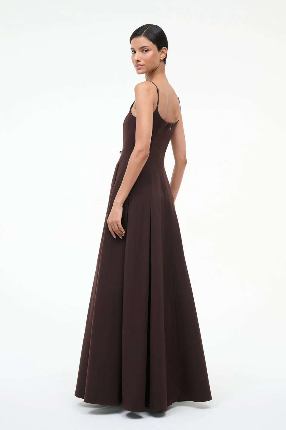 A formfitting bodice sweeping into a maxi a-line skirt, the Joy features hidden side pockets and a hidden zipper closure down the back.
