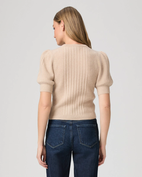 The Kato Top is a short sleeve sweater crafted from 100% cashmere in a soft oatmeal hue. Featuring a subtle mixed rib texture and softly puffed sleeves, it’s the perfect blend of cozy luxury with modern, feminine details.