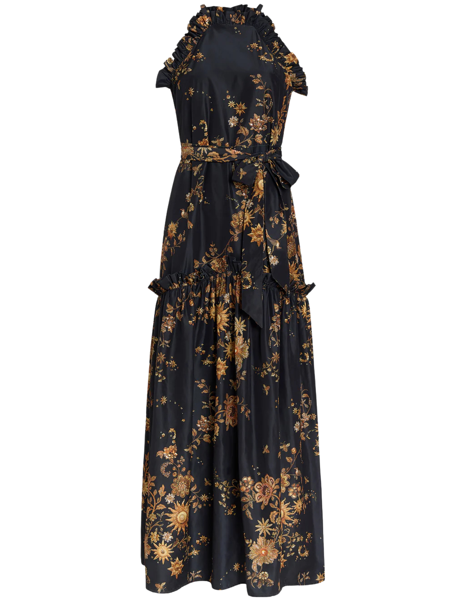 Keenan provides an elegant solution to the pre-party “what to wear?” panic. The silky halter-style column with ruffle detailing at the neck and skirt can be worn loose or cinched at the waist with an optional tie belt, and features our scene-stealing Gilded print, a photorealistic celestial floral in metallic gold against an inky black ground.