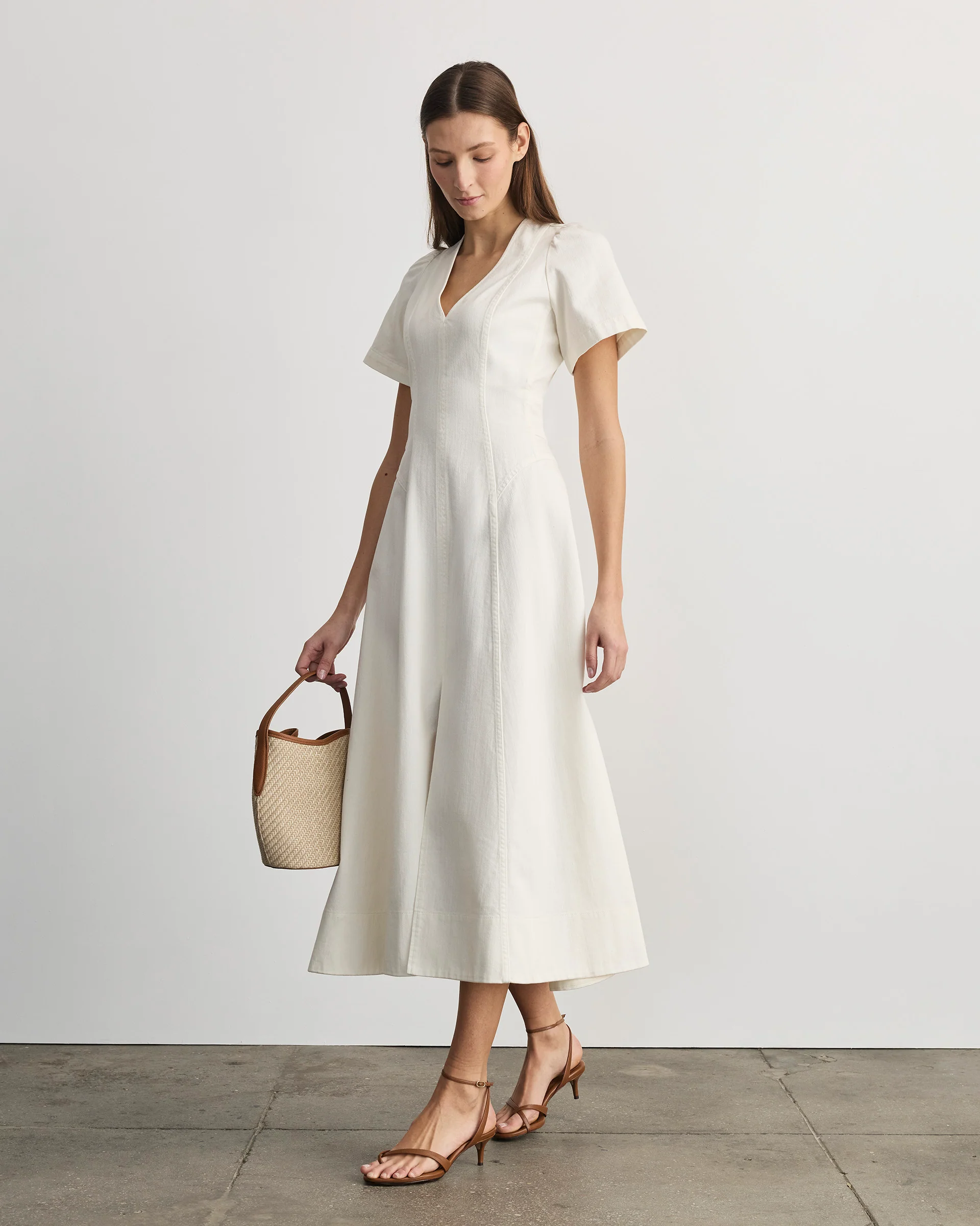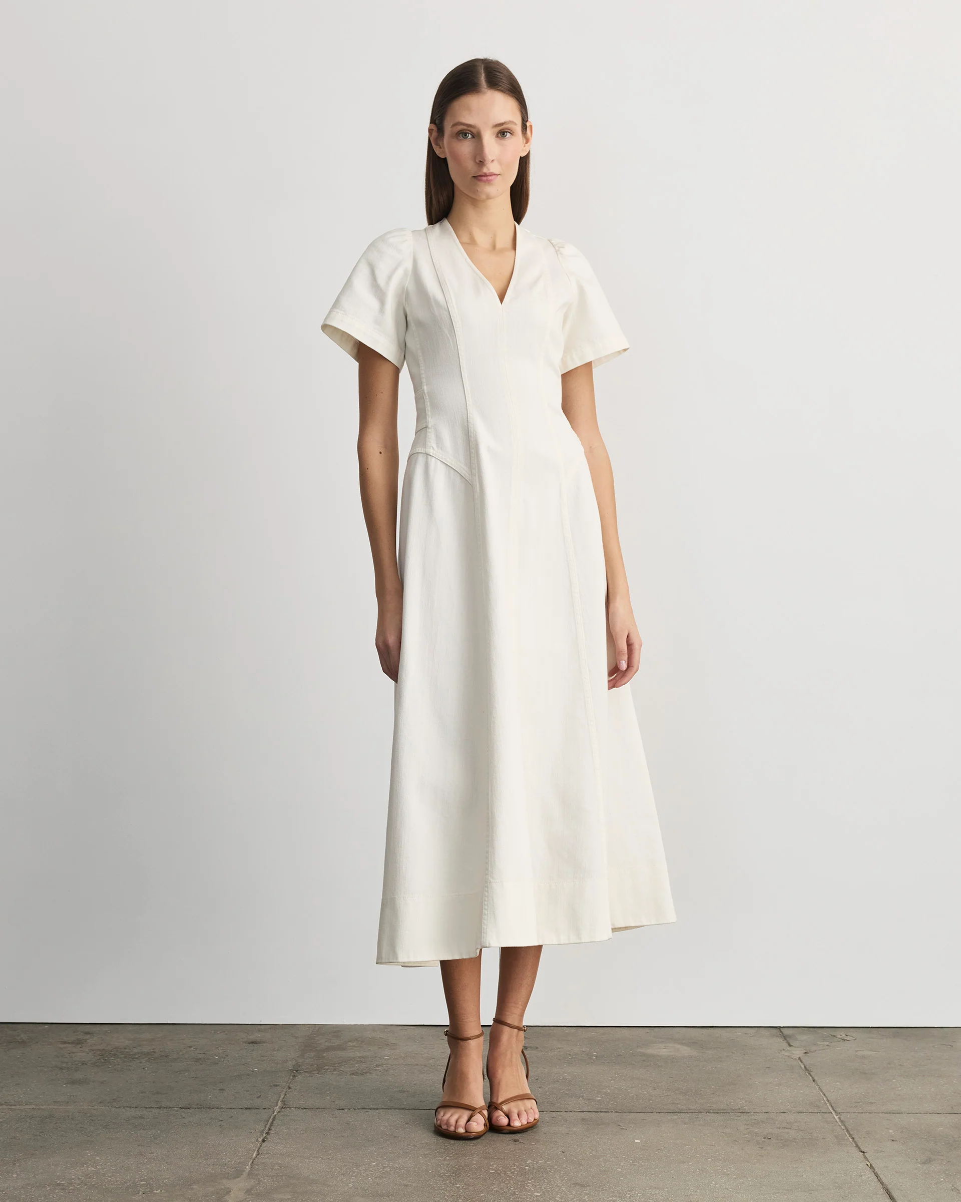 Designed in a soft chalk denim and featuring a v-neckline and slight flutter sleeves, Midi Renzo is an effortless silhouette with seam detailing that elongates and flatters.