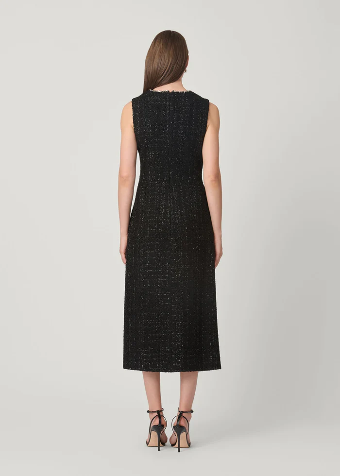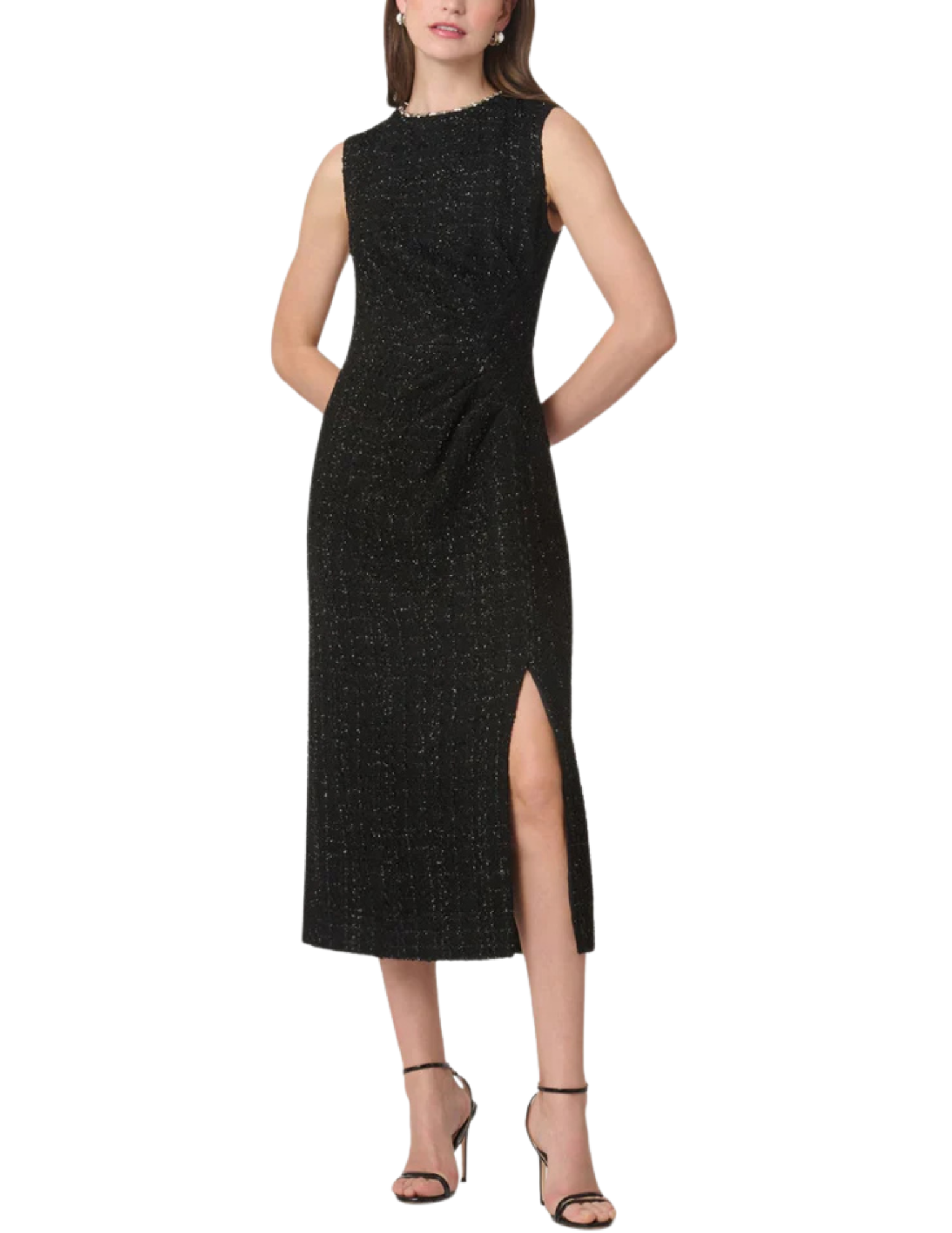 This festive tweed dress features beautiful crystal embellishment at the neckline. The bodice has a side pleating detail for added interest, and the lower part of the skirt features a slit. Fully lined with a center back invisible zipper.