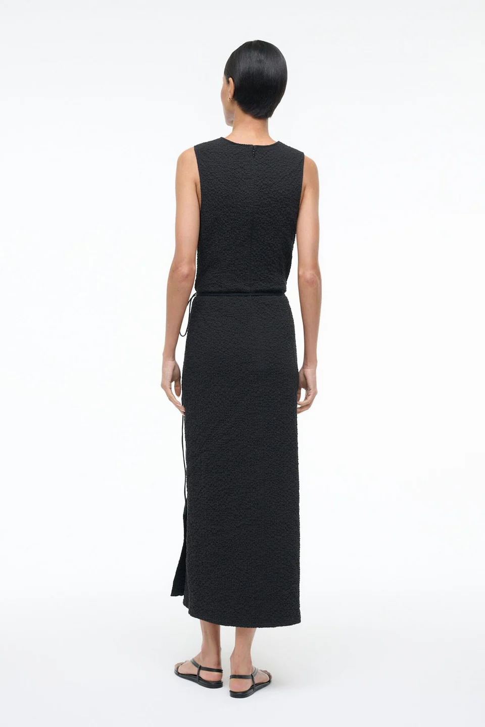 Back zip closure with adjustable waist tie anchors The Nema smocked cotton dress. The functional wrap skirt creates flattering movement and versatile styling options.