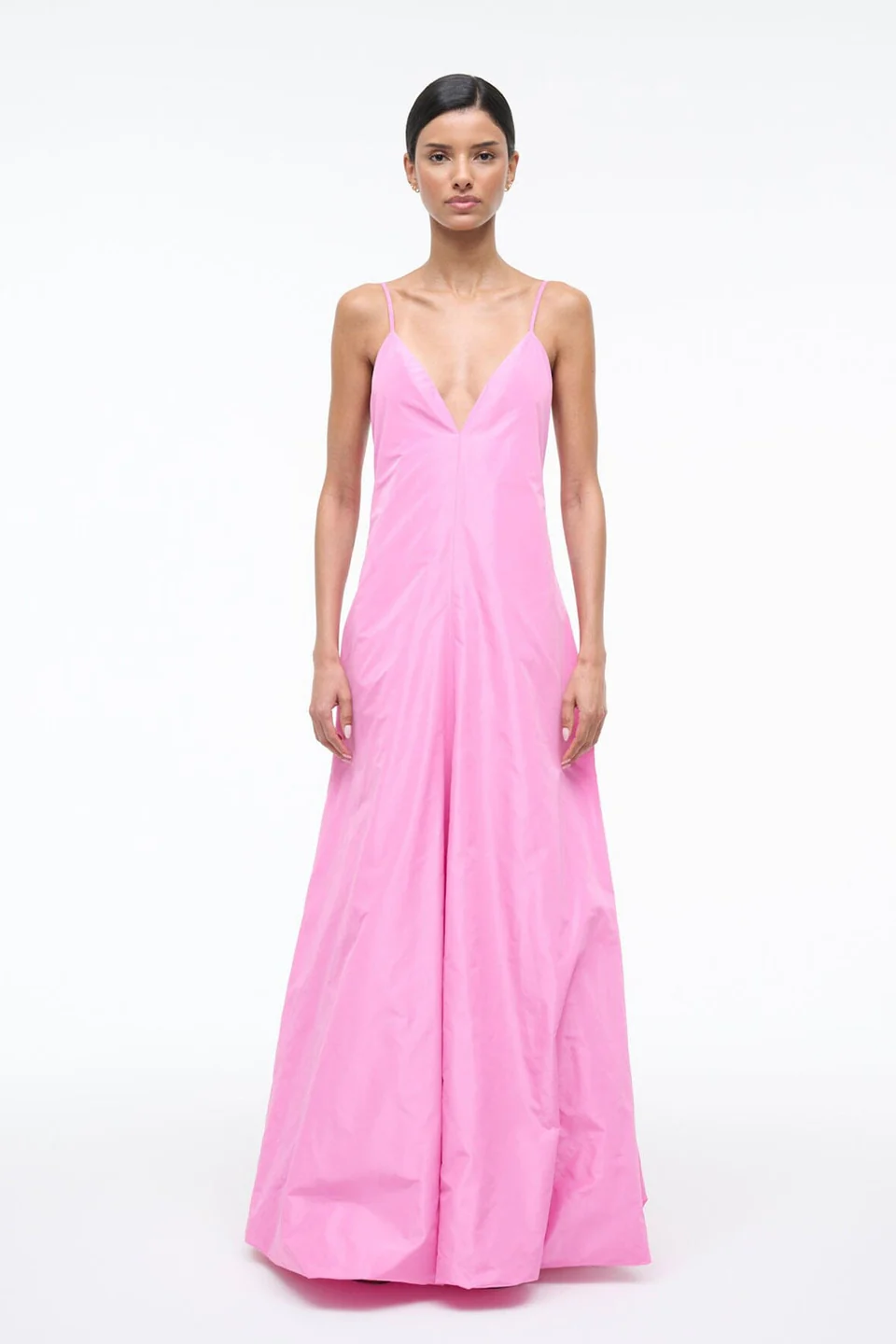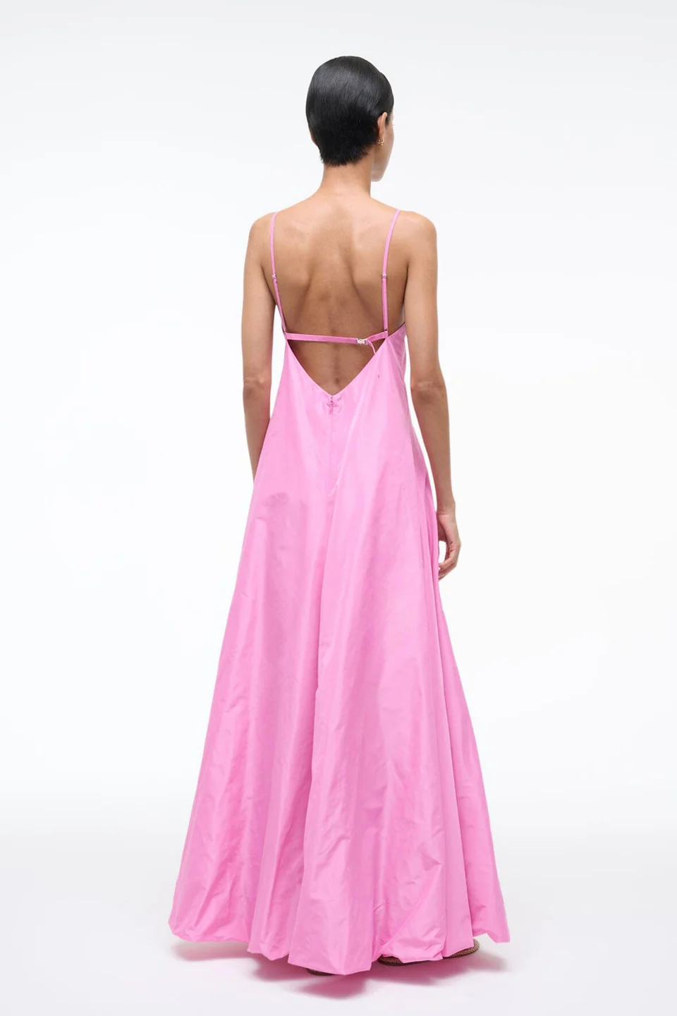 The Paloma is Staud’s newest taffeta dress featuring a flattering V-neckline and voluminous skirt. Adjustable cami straps and convenient back speed-clip closure for easy wear. Perfect for special occasions.