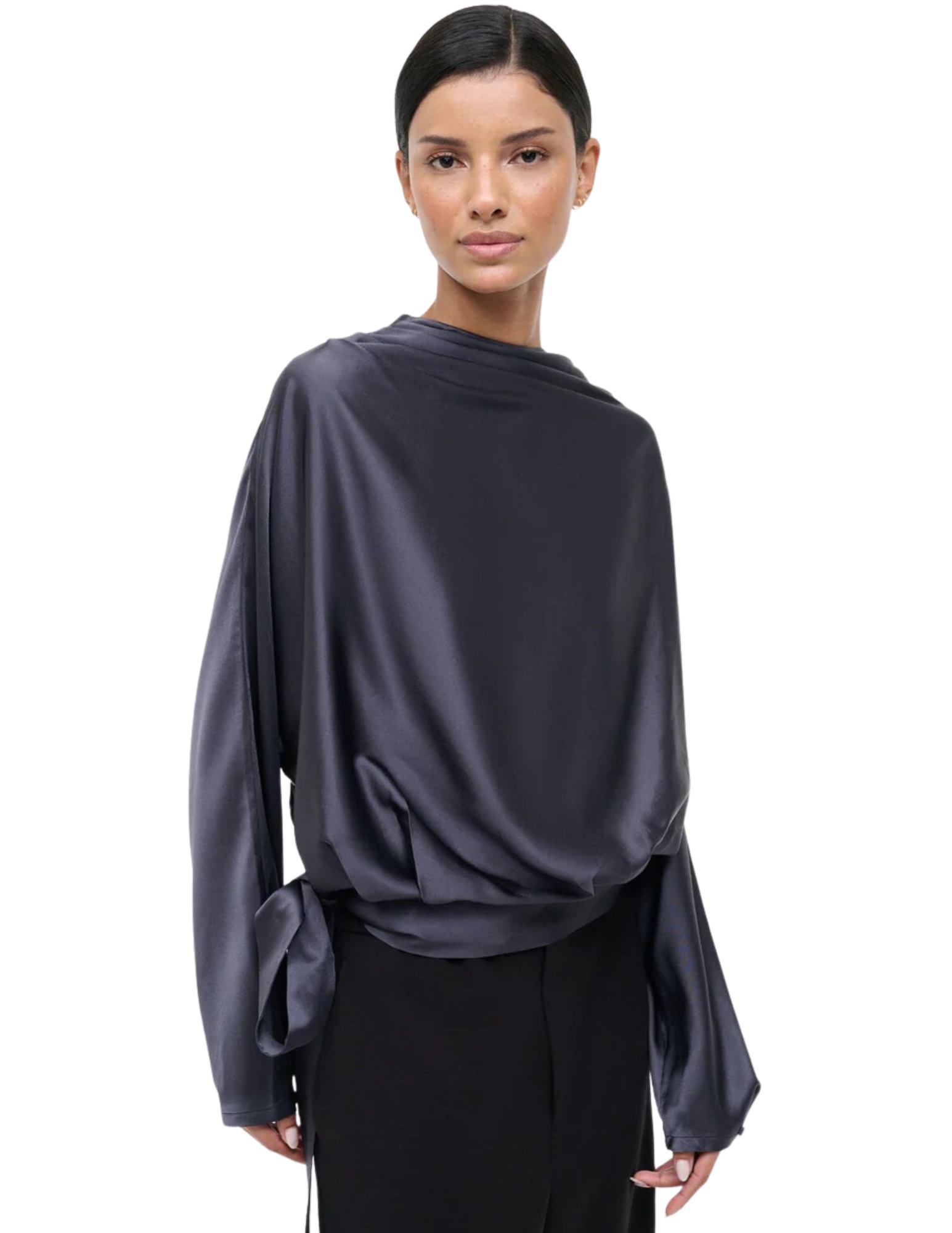 The Phoebe Silk Top is a dolman sleeved top crafted from a stretch silk satin fabric with a side tie detail at the waist and draped neckline.