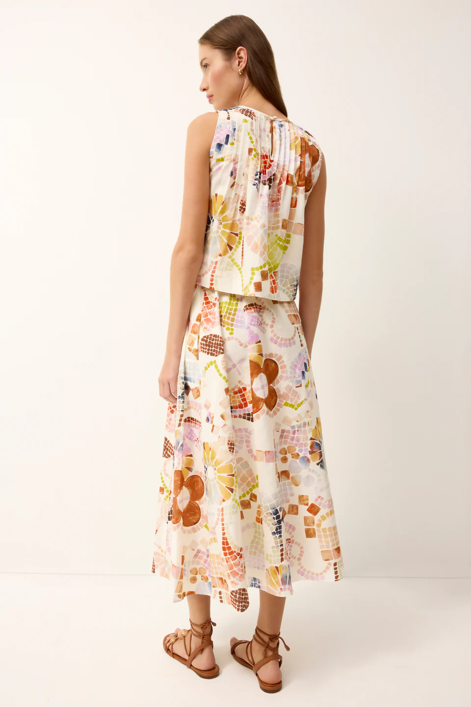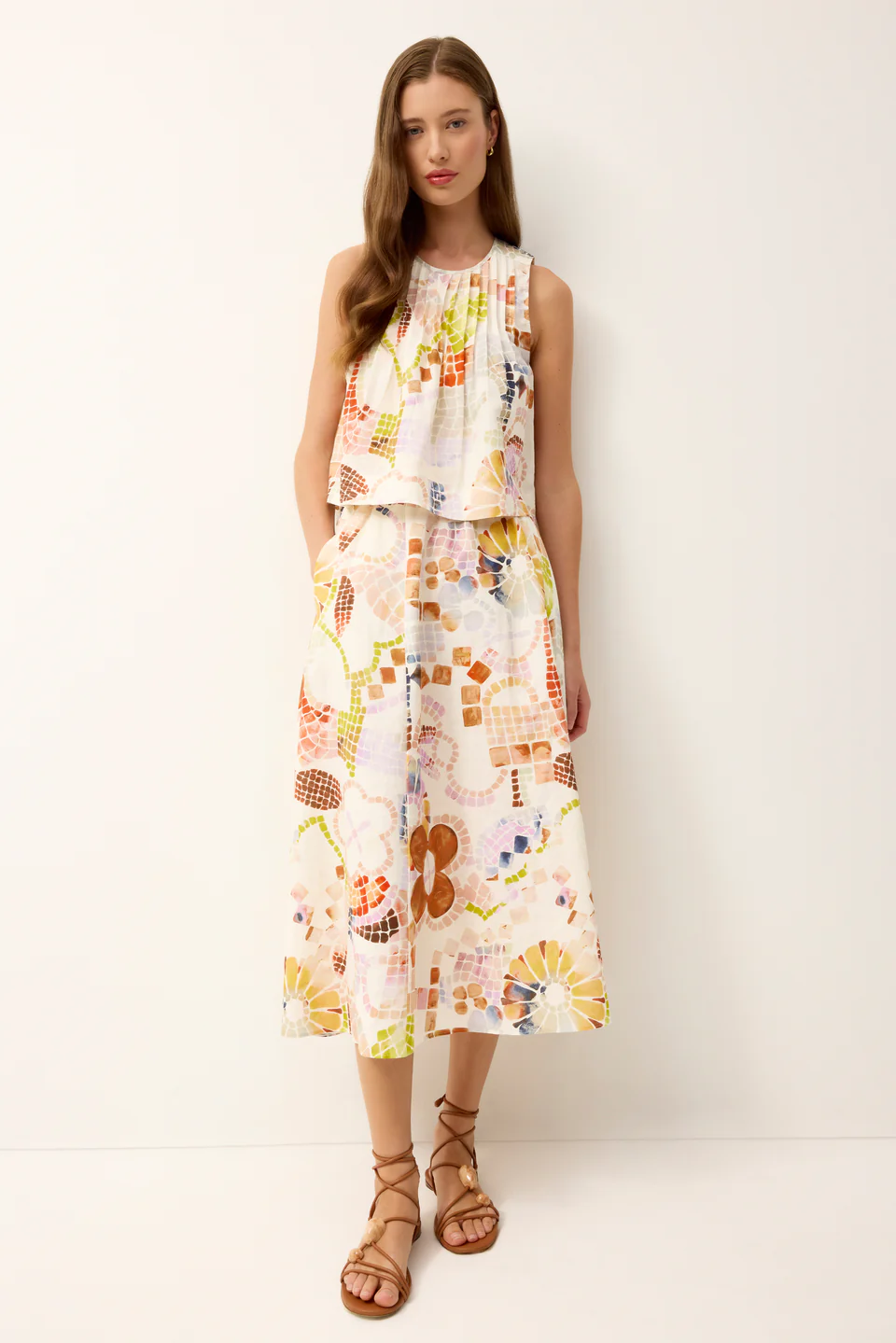 The Sasha skirt is as fun to wear as it is flattering. A best-selling silhouette, it features easy volume, a comfortable elastic waistband that sits at the natural waist, and pockets for everyday practicality. This season, Sasha gets an artful touch in Travertine, a rainbow watercolor mosaic print. Pair it with a simple tank or the matching Letta top for a polished, print-forward look.