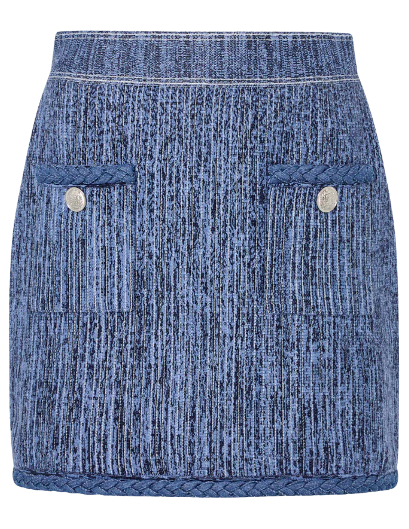 Milly’s signature knit skirt is offered in a blue pinstripe version that is meant to fit close to the body. It’s accented with braided detail across the pockets and hemline. For the full look, wear it with its coordinating Shayne Pinstripe Knit Jacket.