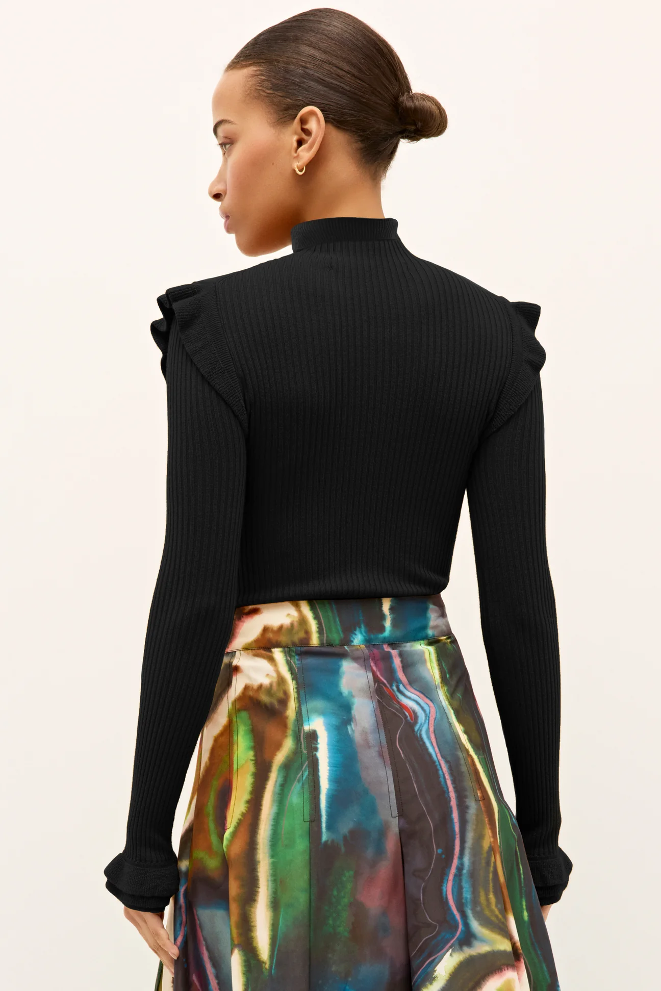 Tinley doesnβt play favorites. Ribbed and ruffled, this lightweight, form-fitting turtleneck is the perfect layering piece. Throw her on under a sleeveless maxi to extend the wearability of the dress, or tuck her into nearly any piece in our fall/winter skirt and short programs. In classic Black, sheβs about as versatile as it gets.